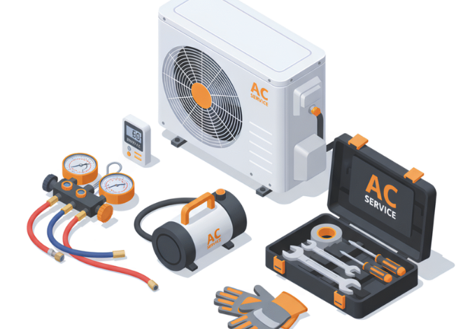 Teknisi Sampurna Jaya Teknik AC sedang mengisi freon AC di Jakarta dengan alat manifold gauge profesional
